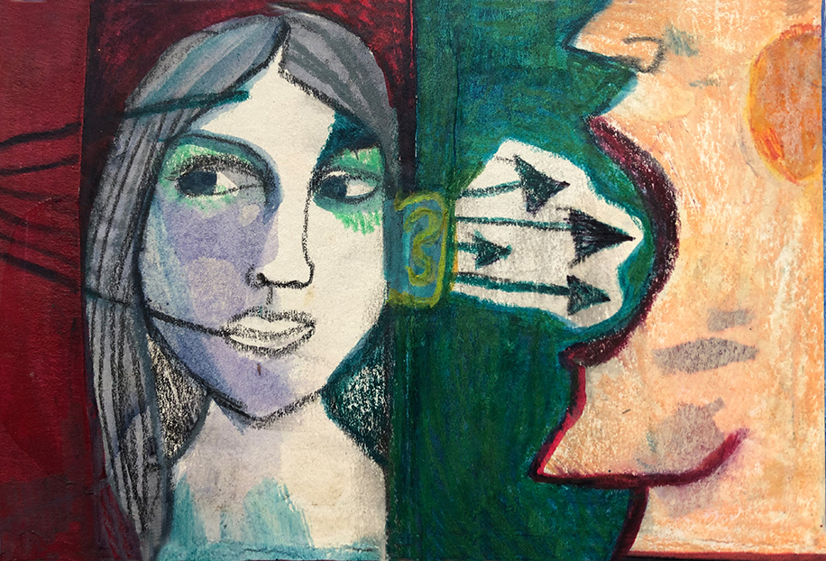 "Output", kleinformatige Arbeit Aquarell und Buntstift auf Papier